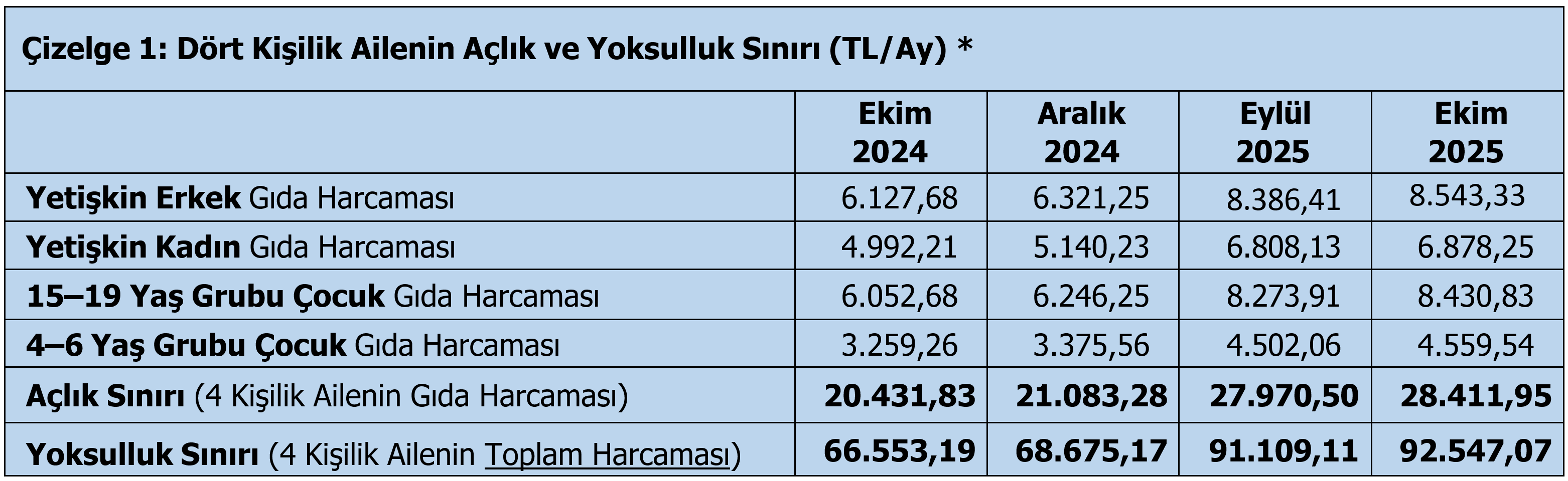 TÜRK-İŞ Konfederasyonu tarafından, çalışanların geçim koşullarını ortaya koymak ve temel ihtiyaç maddelerindeki fiyat değişikliğinin aile bütçesine yansımalarını belirlemek amacıyla her ay, düzenli olarak yapılan bu araştırmanın 2025 Ekim ayı sonucuna göre;