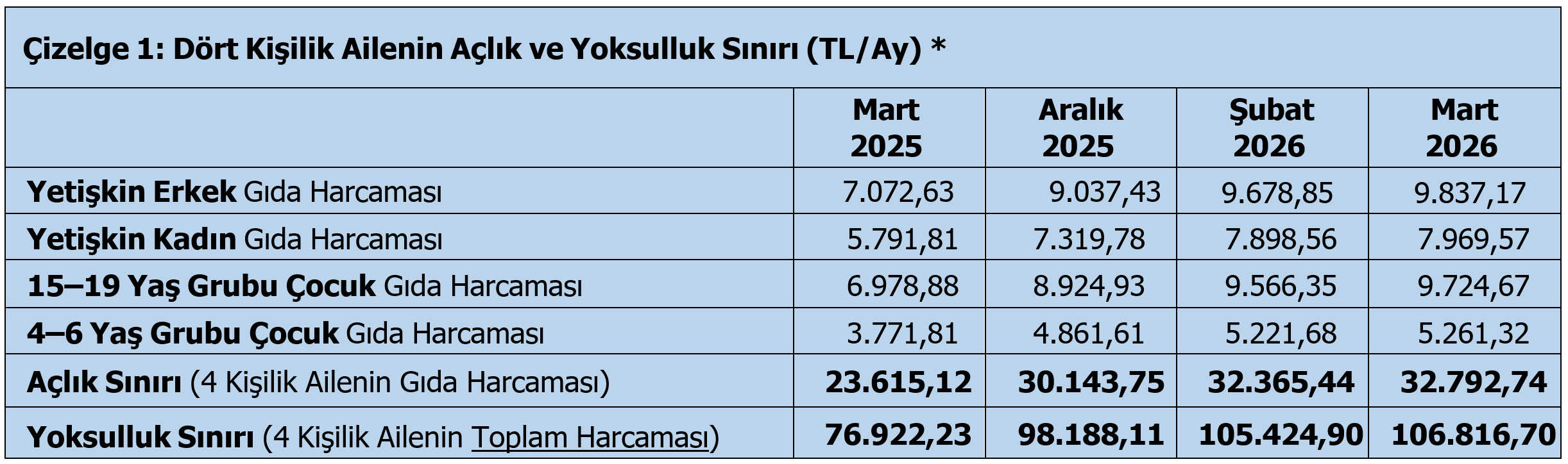 • Ankara’da yaşayan dört kişilik bir ailenin sağlıklı, dengeli ve yeterli beslenebilmesi için yapılması gereken aylık gıda harcaması tutarı (açlık sınırı) 32.792,74 TL’ye,